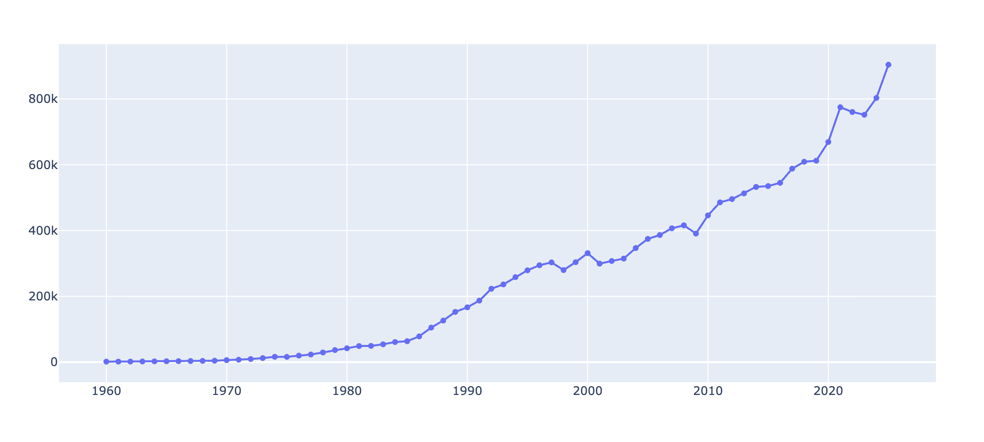 import numpy as np import pandas as pd import csv # 匯入plotly套件,以便繪製視覺化圖形 from plotly.offline import download_plotlyjs, init_notebook_mode, plot, iplot import plotly.graph_objs as go data = pd.read_csv('gdp_taiwan.csv') data.head() Taiwan = data.loc[0][1:] years = np.linspace(1960, 2025, 66) # 製造從 1960 至 2025 的年 # Create traces trace = go.Scatter( x = years, y = Taiwan, mode = 'lines+markers' ) data = [trace] iplot(data, filename='scatter-mode')