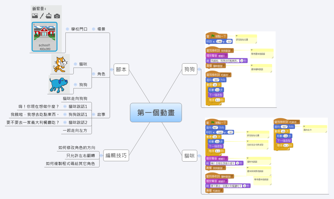 小貓和狗狗相遇在學校門口,開啟一段對話。