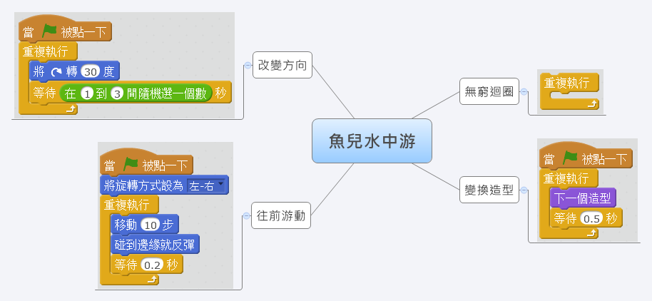 遊戲方法:按下綠旗,讓魚兒在水中不斷地游動。