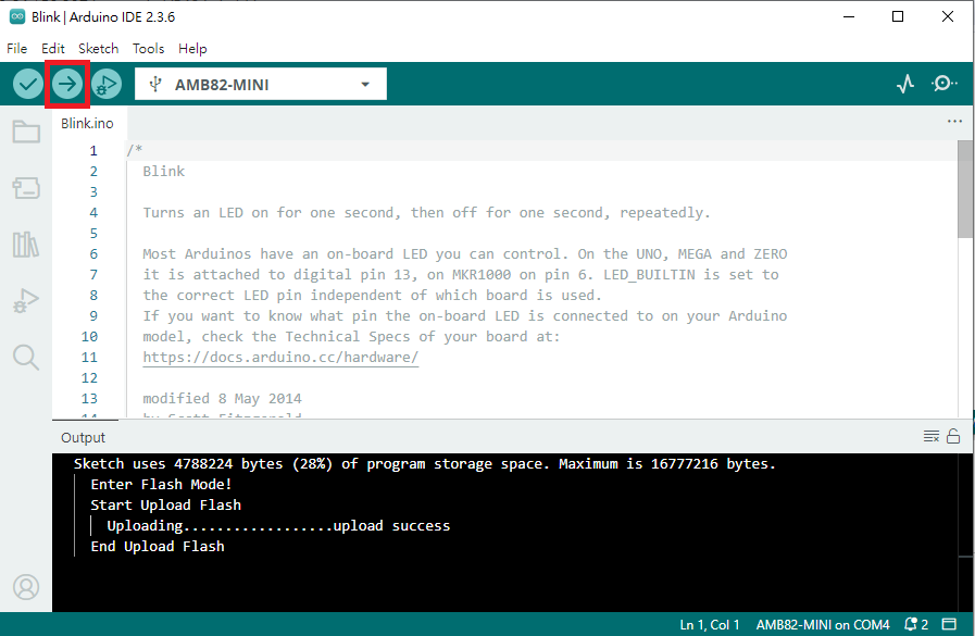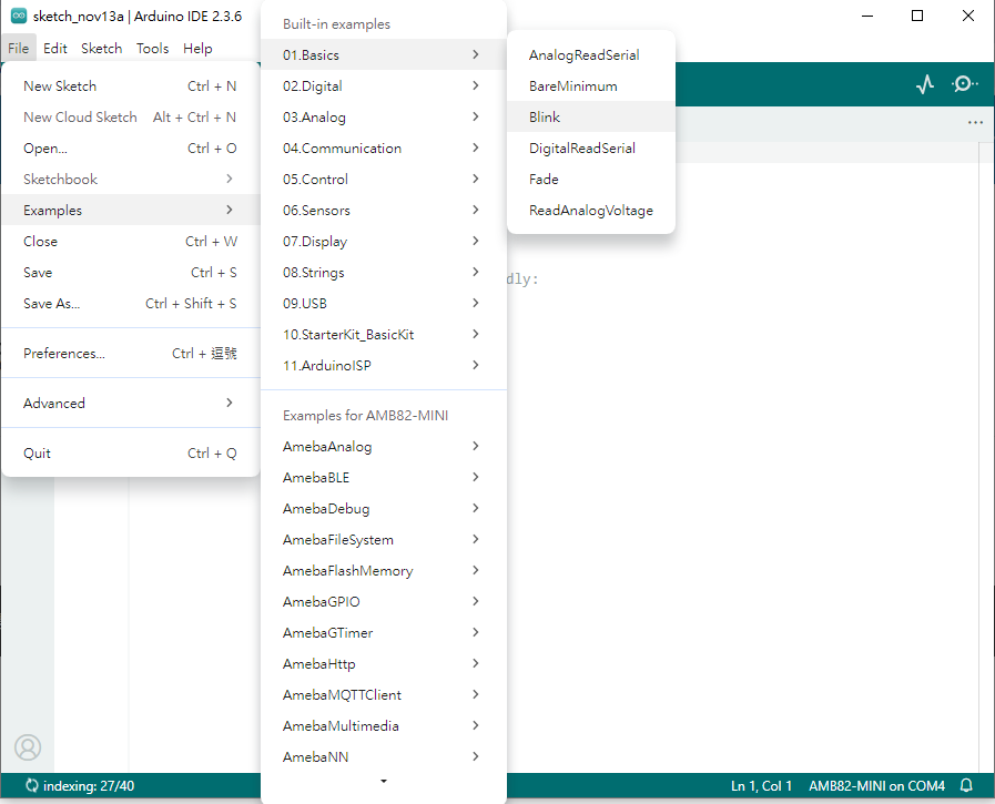從Arduino內建的範例中,開啟程式碼,如下圖。