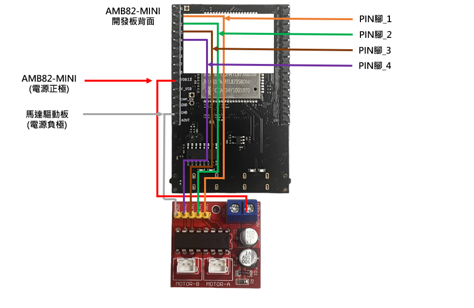 #include "StreamIO.h" #include "VideoStream.h" #include "NNObjectDetection.h" #include "VideoStreamOverlay.h" #include "ObjectClassList.h" #include "AmebaServo.h" #define CHANNEL 0 #define CHANNELNN 3 #define NNWIDTH 640 #define NNHEIGHT 640 VideoSetting config(VIDEO_FHD, 30, VIDEO_H264, 0); VideoSetting configNN(NNWIDTH, NNHEIGHT, 10, VIDEO_RGB, 0); NNObjectDetection ObjDet; StreamIO videoStreamer(1, 1); StreamIO videoStreamerNN(1, 1); // PWM 腳位 int a = 1; int b = 2; int c = 3; int d = 4; // PWM 控制參數 const int maxPWM = 180; const int turnMaxPWM = 90; void setup() { Serial.begin(115200); pinMode(a, OUTPUT); pinMode(b, OUTPUT); pinMode(c, OUTPUT); pinMode(d, OUTPUT); config.setBitrate(2 * 1024 * 1024); Camera.configVideoChannel(CHANNEL, config); Camera.configVideoChannel(CHANNELNN, configNN); Camera.videoInit(); ObjDet.configVideo(configNN); ObjDet.modelSelect(OBJECT_DETECTION, CUSTOMIZED_YOLOV7TINY, NA_MODEL, NA_MODEL); ObjDet.configThreshold(0.2, 0.2); ObjDet.begin(); videoStreamer.registerInput(Camera.getStream(CHANNEL)); if (videoStreamer.begin() != 0) { Serial.println("StreamIO link start failed"); } Camera.channelBegin(CHANNEL); videoStreamerNN.registerInput(Camera.getStream(CHANNELNN)); videoStreamerNN.setStackSize(); videoStreamerNN.setTaskPriority(); videoStreamerNN.registerOutput(ObjDet); if (videoStreamerNN.begin() != 0) { Serial.println("StreamIO link start failed"); } Camera.channelBegin(CHANNELNN); } void loop() { std::vector<ObjectDetectionResult> results = ObjDet.getResult(); uint16_t im_w = config.width(); if (ObjDet.getResultCount() > 0) { int bestIndex = -1; float highestScore = -1.0; for (int i = 0; i < ObjDet.getResultCount(); i++) { if (results[i].score() > highestScore) { highestScore = results[i].score(); bestIndex = i; } } if (bestIndex != -1) { int obj_type = results[bestIndex].type(); if (itemList[obj_type].filter) { ObjectDetectionResult item = results[bestIndex]; int xmin = (int)(item.xMin() * im_w); int xmax = (int)(item.xMax() * im_w); int xcenter = (xmin + xmax) / 2; const char* position; if (xcenter < im_w / 3) { position = "左半部"; } else if (xcenter > 2 * im_w / 3) { position = "右半部"; } else { position = "中間"; } if (position == "中間") { // 前進 analogWrite(a, 0); // 右後停 analogWrite(b, maxPWM); // 右前轉 analogWrite(c, 0); // 左後停 analogWrite(d, maxPWM); // 左前轉 } else if (position == "右半部") { // 右轉 analogWrite(a, 0); analogWrite(b, turnMaxPWM); // 右前較慢 analogWrite(c, 0); analogWrite(d, maxPWM); // 左前較快 } else if (position == "左半部") { // 左轉 analogWrite(a, 0); analogWrite(b, maxPWM); // 右前較快 analogWrite(c, 0); analogWrite(d, turnMaxPWM); // 左前較慢 } else { analogWrite(a, 0); analogWrite(b, 0); analogWrite(c, 0); analogWrite(d, 0); } delay(200); // 保持動作一段時間 // 停車 analogWrite(a, 0); analogWrite(b, 0); analogWrite(c, 0); analogWrite(d, 0); } } } delay(100); }最後將.h檔內的itemList改成你要偵測的物品數量和物品名稱就可以執行了 (多的刪掉)