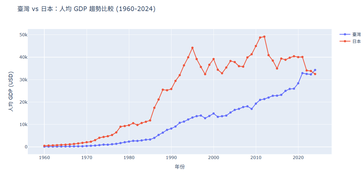 import pandas as pd import numpy as np import plotly.graph_objs as go import plotly.io as pio # 針對 Colab 的顯示設定 pio.renderers.default = 'colab' # 1. 讀取資料 data1 = pd.read_csv('gdp_taiwan2024.csv') data2 = pd.read_csv('gdp_world2024.csv') data3 = pd.read_csv('population_taiwan2024.csv') data4 = pd.read_csv('population_world2024.csv') # 2. 提取台灣資料 臺灣逐年GDP = data1.loc[0, '1960':'2024'] 臺灣逐年人口 = data3.loc[0, '1960':'2024'] # 3. 提取日本資料 日本的GDP = data2[data2['Country Name'] == 'Japan'] 日本逐年GDP = 日本的GDP.loc[:, '1960':'2024'].iloc[0] 日本的人口 = data4[data4['Country Name'] == 'Japan'] 日本逐年人口 = 日本的人口.loc[:, '1960':'2024'].iloc[0] # 4. 確保資料為數值型態並計算人均 GDP # 台灣單位換算:假設 GDP 為百萬美元,所以乘以 1,000,000 臺灣人均GDP = 臺灣逐年GDP * 1000000 / 臺灣逐年人口 日本人均GDP = 日本逐年GDP / 日本逐年人口 # 5. 設定年份 (從 1960 到 2024,共 65 年) 年份 = np.arange(1960, 2025) # 6. 將要繪製的拆線圖拼成一個串列資料 trace1 = go.Scatter( x = 年份, y = 臺灣人均GDP, mode = 'lines+markers', name = '臺灣' ) trace2 = go.Scatter( x = 年份, y = 日本人均GDP, mode = 'lines+markers', name = '日本' ) # 7. 建立 Layout layout = go.Layout( title='臺灣 vs 日本:人均 GDP 趨勢比較 (1960-2024)', xaxis={'title': '年份'}, yaxis={'title': '人均 GDP (USD)'}, hovermode='closest' ) # 8. 組合並顯示 fig = go.Figure(data=[trace1, trace2], layout=layout) fig.show()執行結果