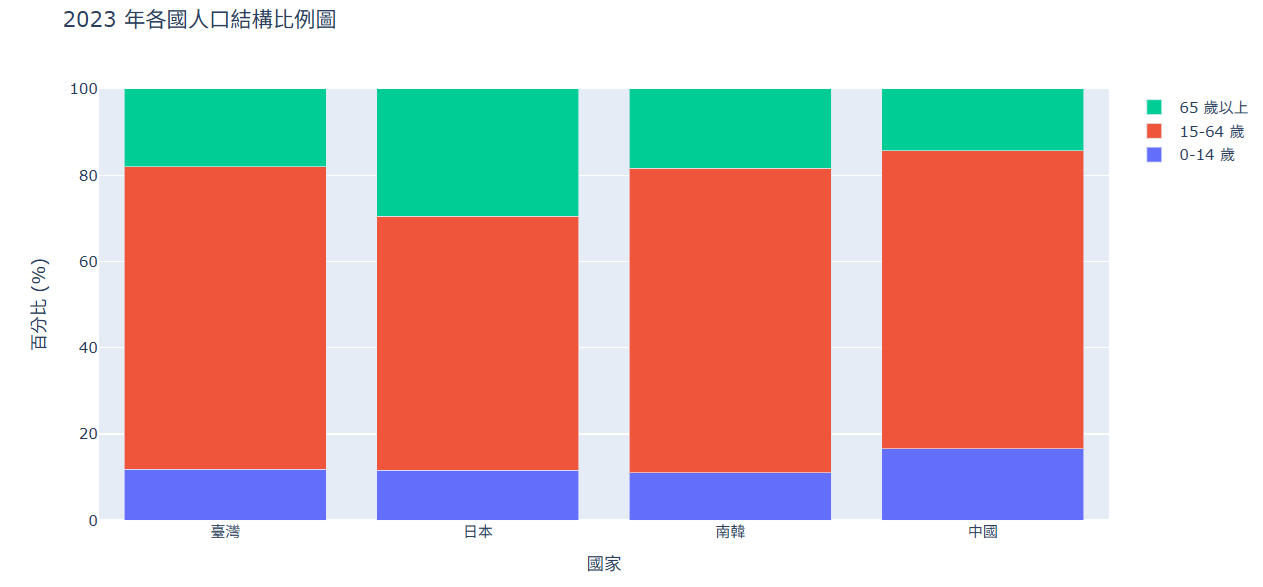 import pandas as pd import numpy as np import plotly.graph_objs as go import plotly.io as pio # 針對 Colab 的顯示設定 pio.renderers.default = 'colab' # 1. 讀取資料 臺灣區間人口數 = pd.read_csv('population_taiwan_age2024.csv') 世界各國區間人口數_0_14 = pd.read_csv('population_world_age2024_0_14.csv') 世界各國區間人口數_15_64 = pd.read_csv('population_world_age2024_15_64.csv') 世界各國區間人口數_65以上 = pd.read_csv('population_world_age2024_65_plus.csv') # 2. 設定參數 目標年份 = '2023' 參考國家 = { '日本': 'Japan', '南韓': 'Korea, Rep.', '中國': 'China' } p1, p2, p3 = [], [], [] country_names = ['臺灣', '日本', '南韓', '中國'] # 3. 處理資料 # --- A. 處理臺灣資料 (修正版) --- # 因為台灣檔案的結構是:年份在「標題」,年齡層標籤在「第一欄(Year)」 tw_p1 = 臺灣區間人口數[臺灣區間人口數['Year'] == 'Age_0_14'][目標年份].values[0] tw_p2 = 臺灣區間人口數[臺灣區間人口數['Year'] == 'Age_15_64'][目標年份].values[0] tw_p3 = 臺灣區間人口數[臺灣區間人口數['Year'] == 'Age_65_Plus'][目標年份].values[0] tw_all = float(tw_p1 + tw_p2 + tw_p3) p1.append(tw_p1 / tw_all * 100) p2.append(tw_p2 / tw_all * 100) p3.append(tw_p3 / tw_all * 100) # --- B. 處理世界各國資料 --- for label, wb_name in 參考國家.items(): v1 = 世界各國區間人口數_0_14[世界各國區間人口數_0_14['Country Name'] == wb_name][目標年份].values[0] v2 = 世界各國區間人口數_15_64[世界各國區間人口數_15_64['Country Name'] == wb_name][目標年份].values[0] v3 = 世界各國區間人口數_65以上[世界各國區間人口數_65以上['Country Name'] == wb_name][目標年份].values[0] total = v1 + v2 + v3 p1.append(v1 / total * 100) p2.append(v2 / total * 100) p3.append(v3 / total * 100) # 4. 繪圖資料 trace1 = go.Bar(x=country_names, y=p1, name='0-14 歲') trace2 = go.Bar(x=country_names, y=p2, name='15-64 歲') trace3 = go.Bar(x=country_names, y=p3, name='65 歲以上') traces=[trace1, trace2, trace3] # 5. 建立 Layout layout = go.Layout( title=f'{目標年份} 年各國人口結構比例圖', xaxis={'title': '國家'}, yaxis={'title': '百分比 (%)', 'range': [0, 100]}, barmode='stack' ) # 6. 組合並顯示 fig = go.Figure(traces, layout=layout) fig.show()執行結果
