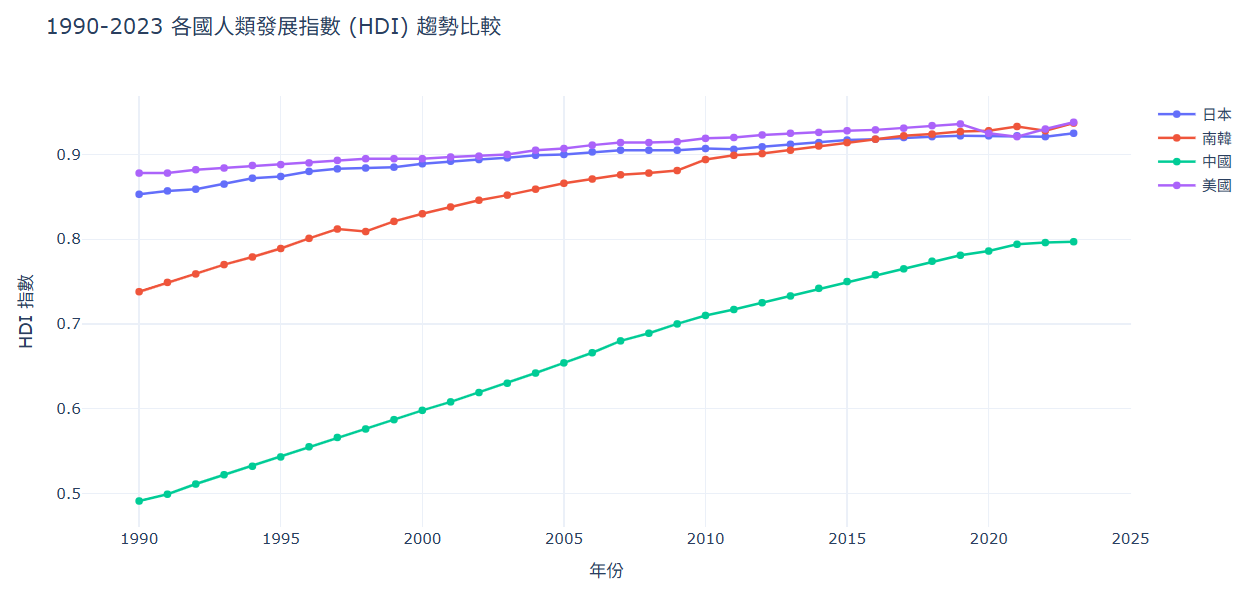 import pandas as pd import plotly.graph_objs as go import plotly.io as pio # 初始化 Colab 顯示模式 pio.renderers.default = 'colab' # 1. 讀取資料 df = pd.read_csv('HDI2023.csv') # 2. 定義目標國家 (對應 CSV 內的 Entity 名稱) # 注意:美國在資料中叫 'United States',南韓叫 'South Korea' 目標國家 = { 'Japan': '日本', 'South Korea': '南韓', 'China': '中國', 'United States': '美國' } traces = [] # 3. 建立各國的折線資料 for english_name, chinese_name in 目標國家.items(): # 篩選該國家的資料 country_data = df[df['Entity'] == english_name] # 建立折線圖軌跡 trace = go.Scatter( x = country_data['Year'], y = country_data['Human Development Index'], mode = 'lines+markers', name = chinese_name ) traces.append(trace) # 4. 設定佈局 layout = go.Layout( title = '1990-2023 各國人類發展指數 (HDI) 趨勢比較', xaxis = {'title': '年份', 'dtick': 5}, # 每隔5年顯示一個刻度 yaxis = {'title': 'HDI 指數'}, hovermode = 'closest', template = 'plotly_white' ) # 5. 顯示圖表 fig = go.Figure(data=traces, layout=layout) fig.show()執行結果